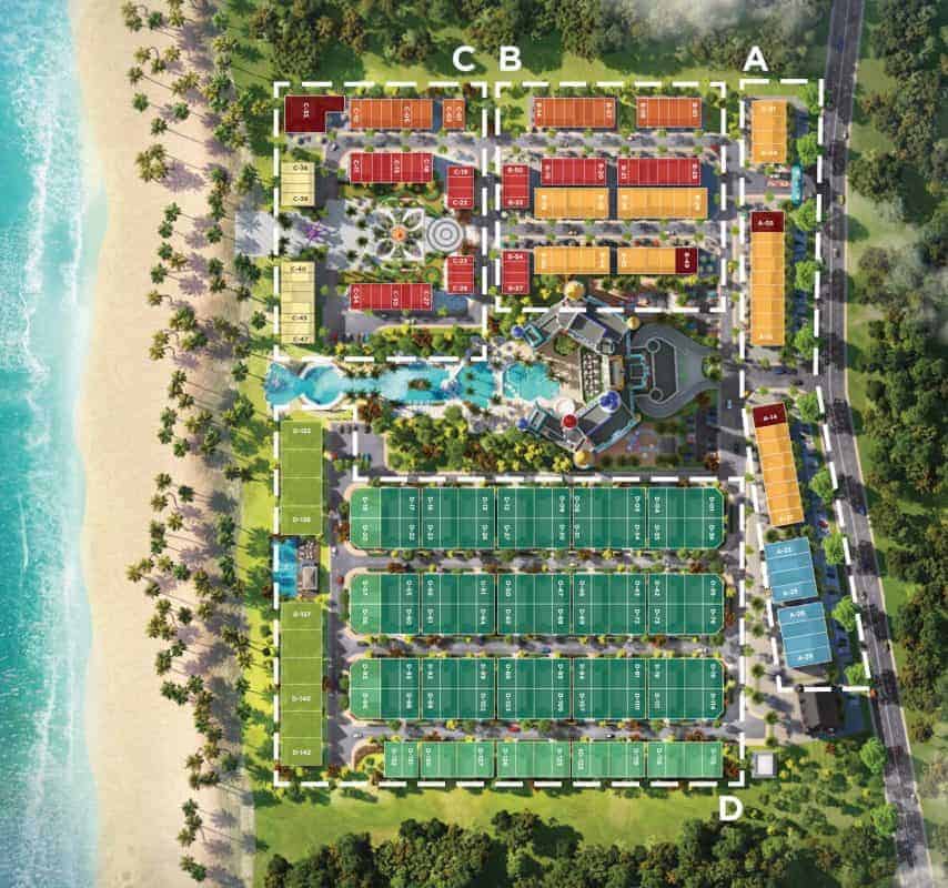 - Loại hình sản phẩm: Khu lưu trú nghỉ dưỡng gồm: khu biệt thự nghỉ dưỡng, Tổ hợp khách sạn 4 sao do Mariot vận hành, Khu khách sạn mini. Khu thương mại dịch vụ: Khu phố thương mại liền kề 125 căn