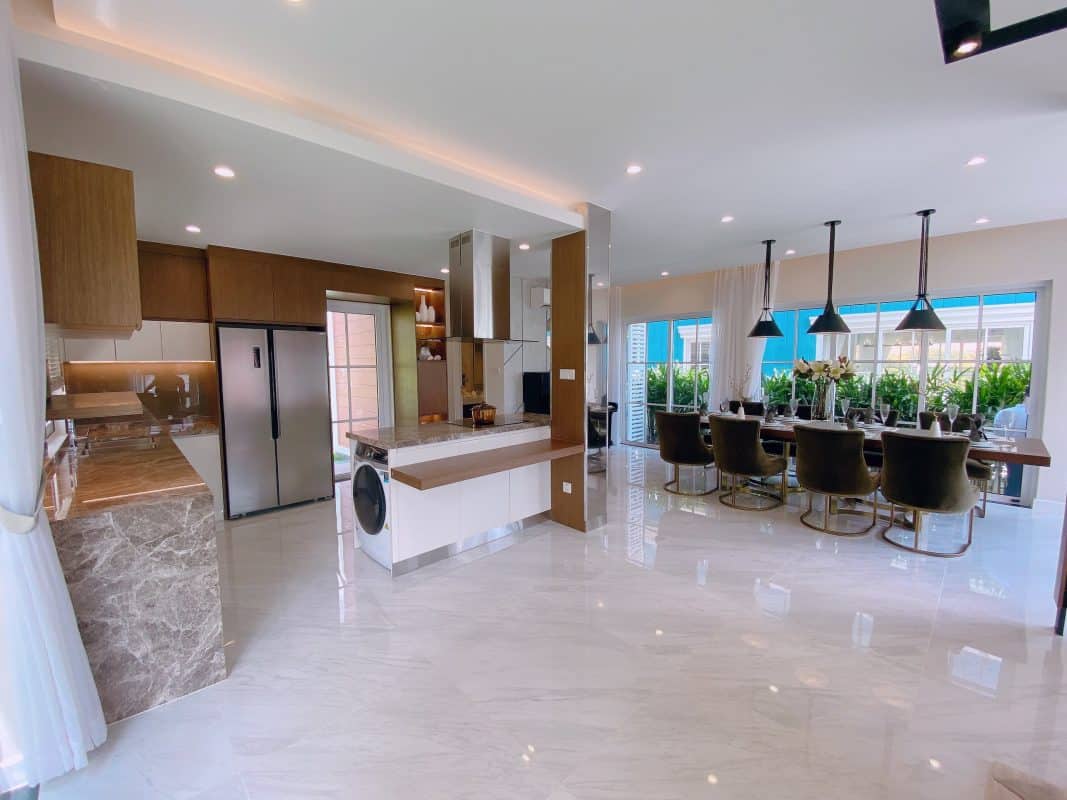 2 phong cách thiết kế không gian tầng 1 nhà mẫu NovaWorld Phan Thiết với 2 chất liệu khác nhau cho khách hàng có thể lựa chọn.
