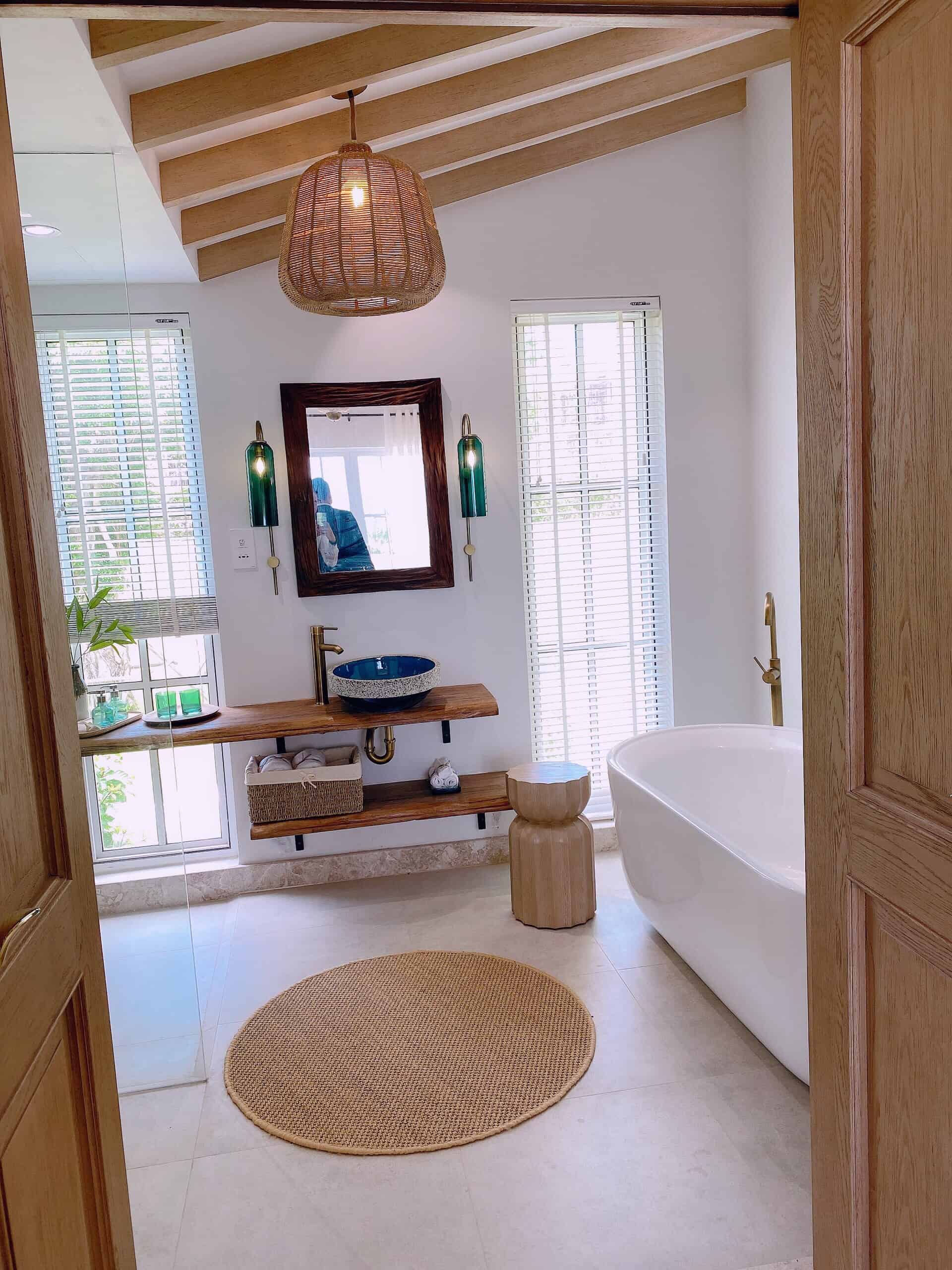 Phòng tắm cũng thiết kế đơn giản với các chất liệu thiên nhiên gần gũi và tinh tế.