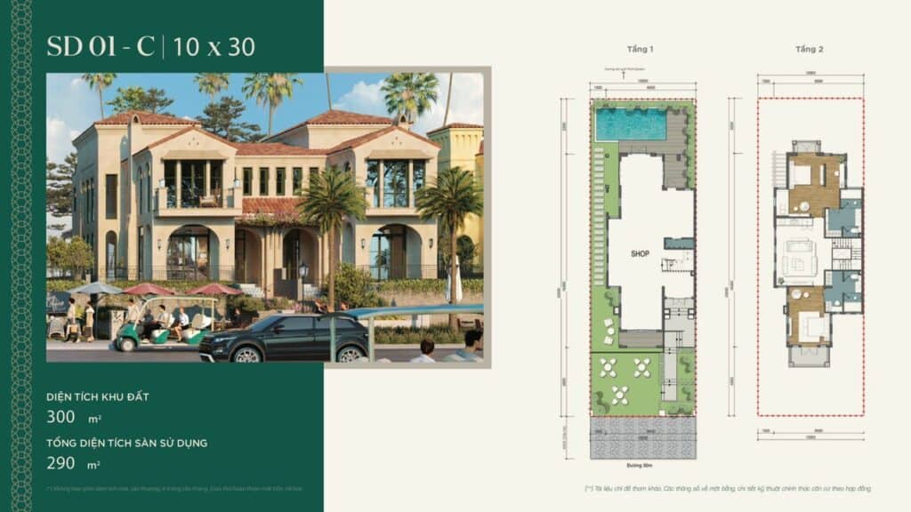 Shop Villa Golf có diện tích đất lớn là 300 m2 (10×30) với khoảng chừa trước là 6,5 m kết hợp với vỉa hè 4m. Tạo khoảng không gian rộng mở phù hợp với các loại hình kinh doanh dịch vụ cao cấp.