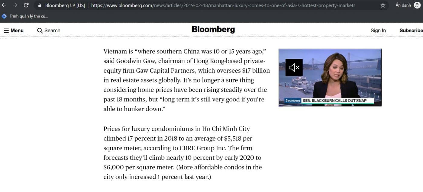 - Bloomberg nhận định: “Dù giá nhà tại Việt Nam đã tăng đều đặn trong 18 tháng qua, nhưng về lâu dài, triển vọng vẫn là rất tốt. Trong đó, BĐS hạng sang là một điểm nóng. Giá nhà chung cư cao cấp tại Thành phố Hồ Chí Minh đã tăng 17% trong năm 2018 lên mức trung bình 5.518 USD mỗi mét vuông, theo CBRE Group Inc., công ty dự báo họ sẽ tăng gần 10% vào đầu năm 2020 lên 6.000 USD mỗi mét vuông. (Các căn hộ giá cả phải chăng hơn trong thành phố chỉ tăng 1% trong năm ngoái). “