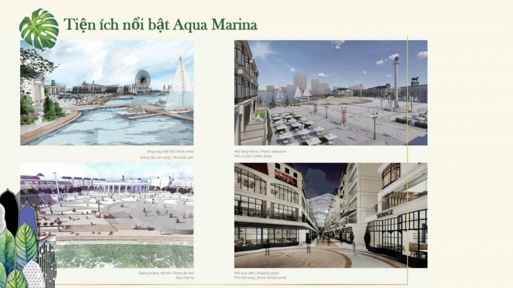Tại Aqua Marina sẽ có Vòng xoay mặt trời, đường dạo bộ ven sông, Quảng trường mặt trời, Nhà hàng Marina, phố mua sắm.