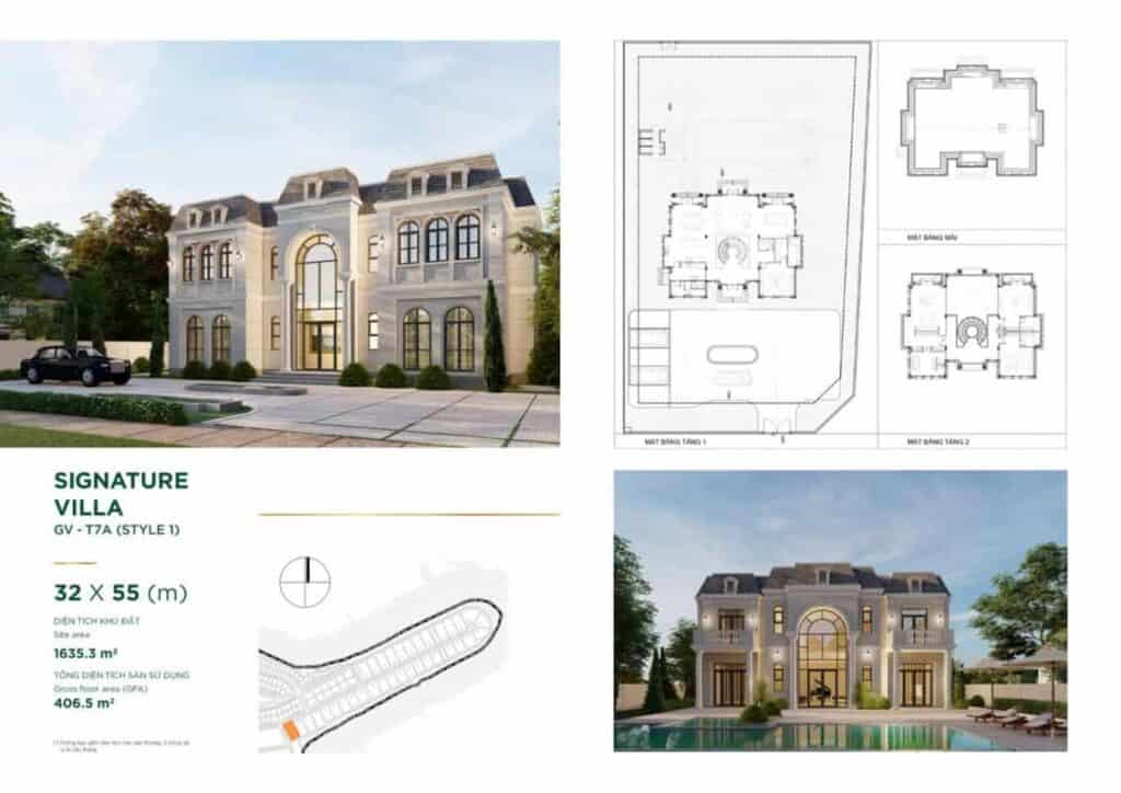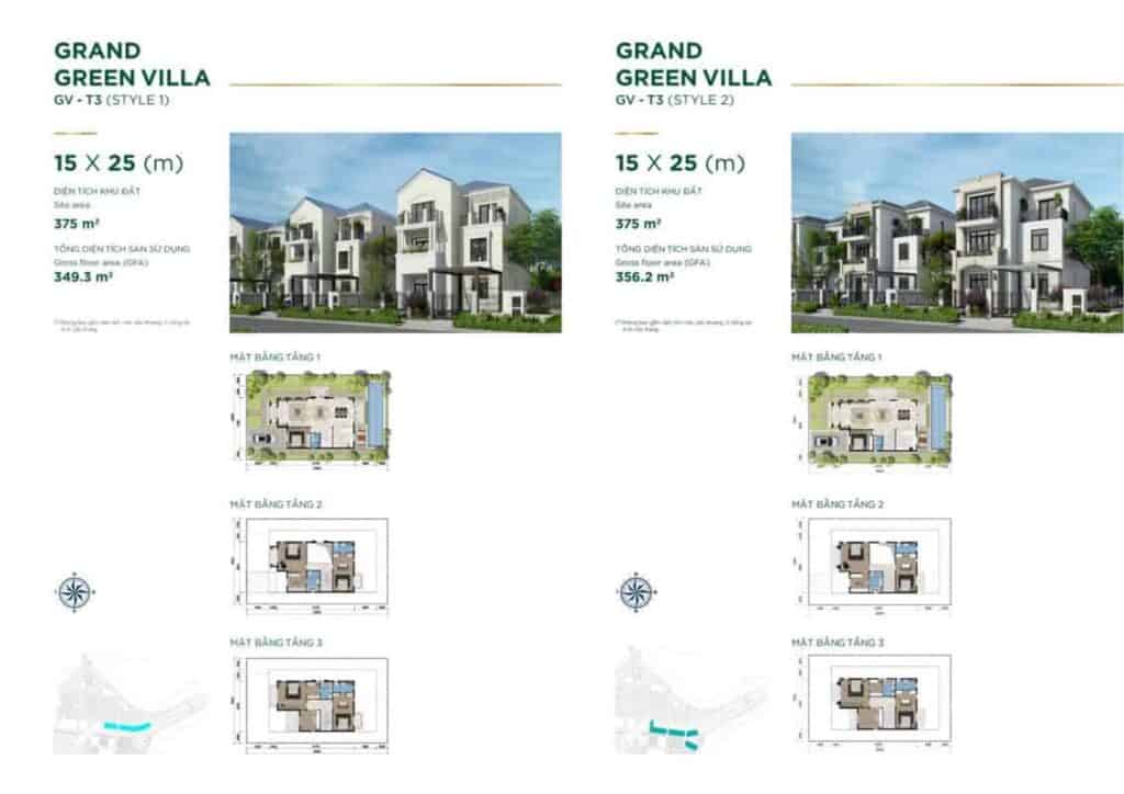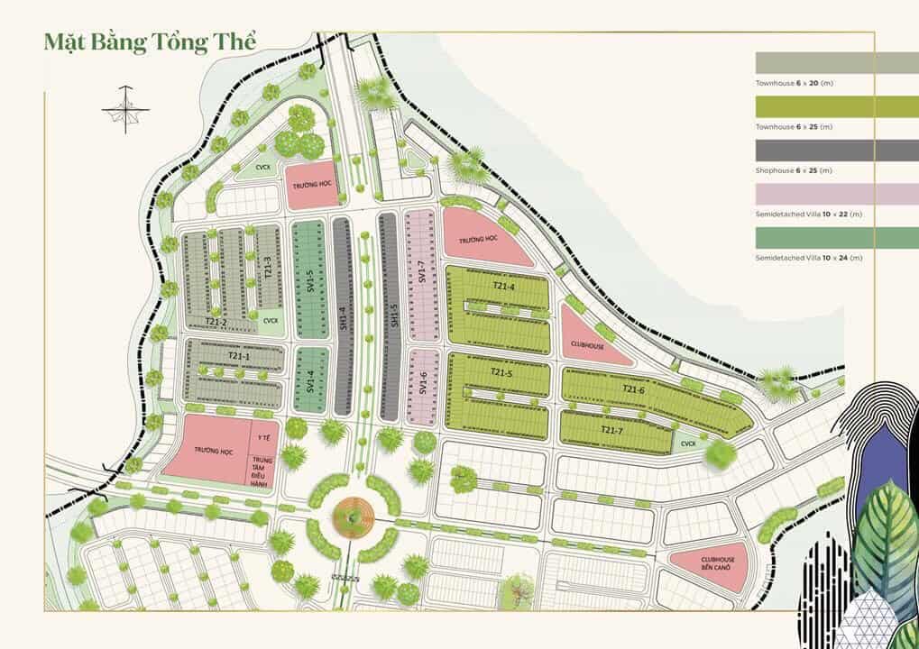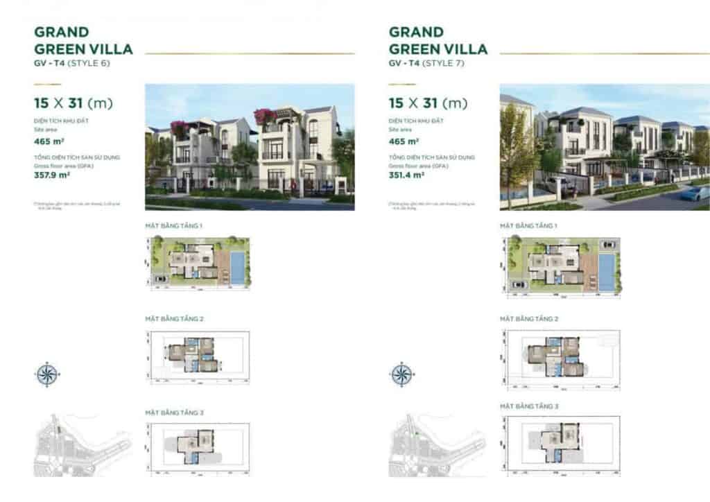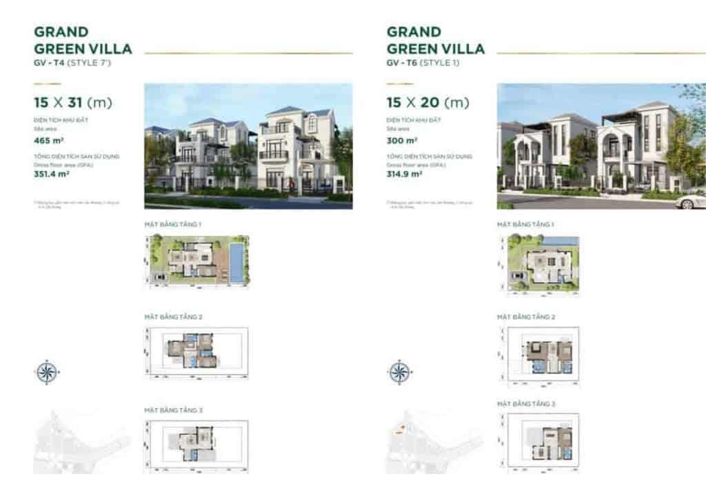 Mặt bằng chi tiết sản phẩm với các loại hình Shophouse 6×20, Nhà phố 6×20, nhà phố 6×25, Biệt thự song lập 10×22, Biệt thự đơn lập 10×24, Biệt thự Grand Green Villas 15×30, Dinh thự 1000-1500m2